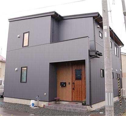 シックな外観に木目の玄関ドアが目を引くスタイリッシュなデザインのお家。